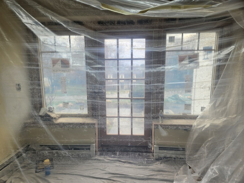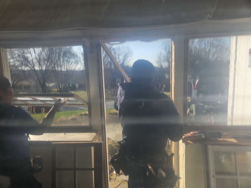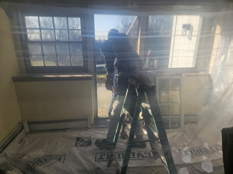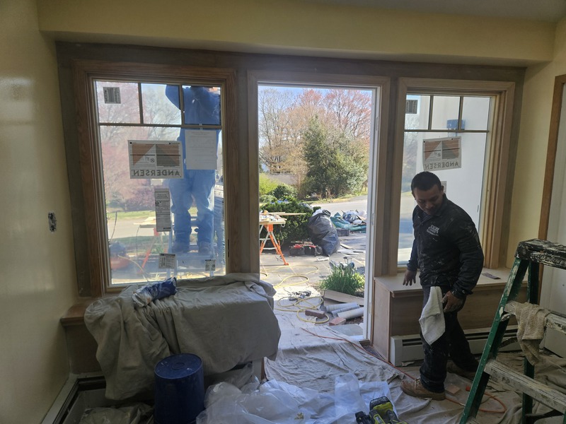 Great Room Entrance Renovation including a new wood ADA 36 X 80 Door, 2 36 X 60 casement windows by Andersen, a custom built Oak wall with custom window seating + Room Painting in Malvern PA by Firm Renovations. Project Management by Tan-Jent Development Company, LLC